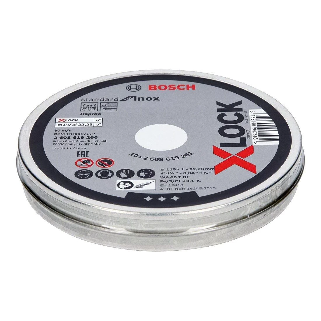 The BOSCH 2608619266 115mm X-LOCK Straight Cutting Discs 10pk Set contains 10 Rapido discs in a recloseable tin. These discs produce straight cuts in stainless steel and inox quickly and efficiently.